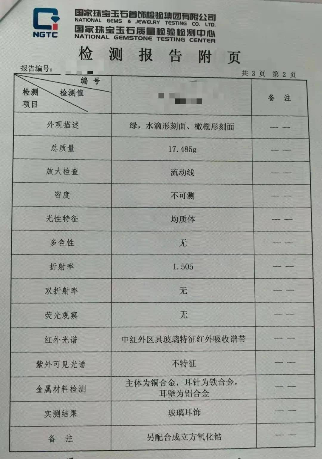 购买者提供了研究相片当作物证,同期2025年5月29日为了自证洁白,他们将这套耳饰送到了国度珠宝大意中心得出的大意成果——【玻璃成品】包含了铜合金,铝合金,铁合金等其他材质。况且大意中心还出具了研究报谈,使命主谈主员暗意“首饰的价值还莫得大意费贵”。