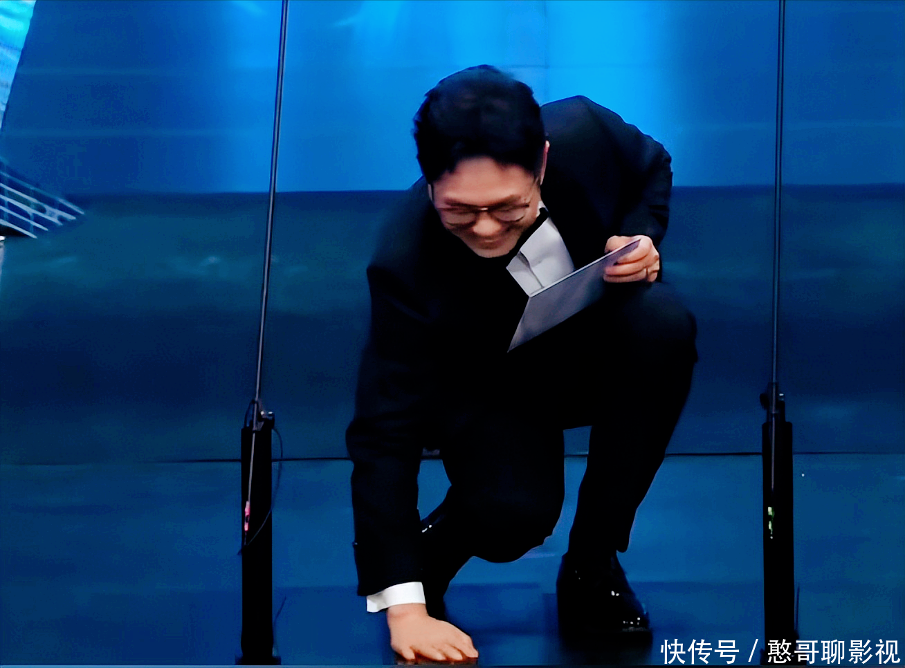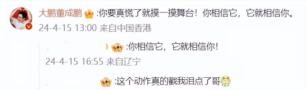 给出一个大笑的神色之后,大鹏蹲下来,温情地抚摸着地板,说了第三句话:“哇,这个舞台......”